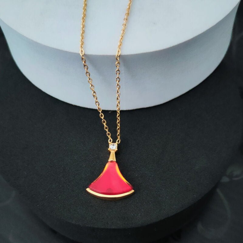- JEWELLRY CARE: Clean regularly using a soft cloth and mild soap or jewellry cleaning solution ( chain , necklace ). Avoid contact of neclace with harsh chemicals, perfumes, and hairspray. Store jewellry in a dry and clean place. Divas’ Dream Necklace is inspired by the enduring beauty of the Roman Caracalla Baths. The fan-shaped pendant is sculpted in precious carnelian stone, topped with a single diamond, and suspended from a rose gold chain. Sophisticated and luxurious, it would make a magnificent gift for a loved one.