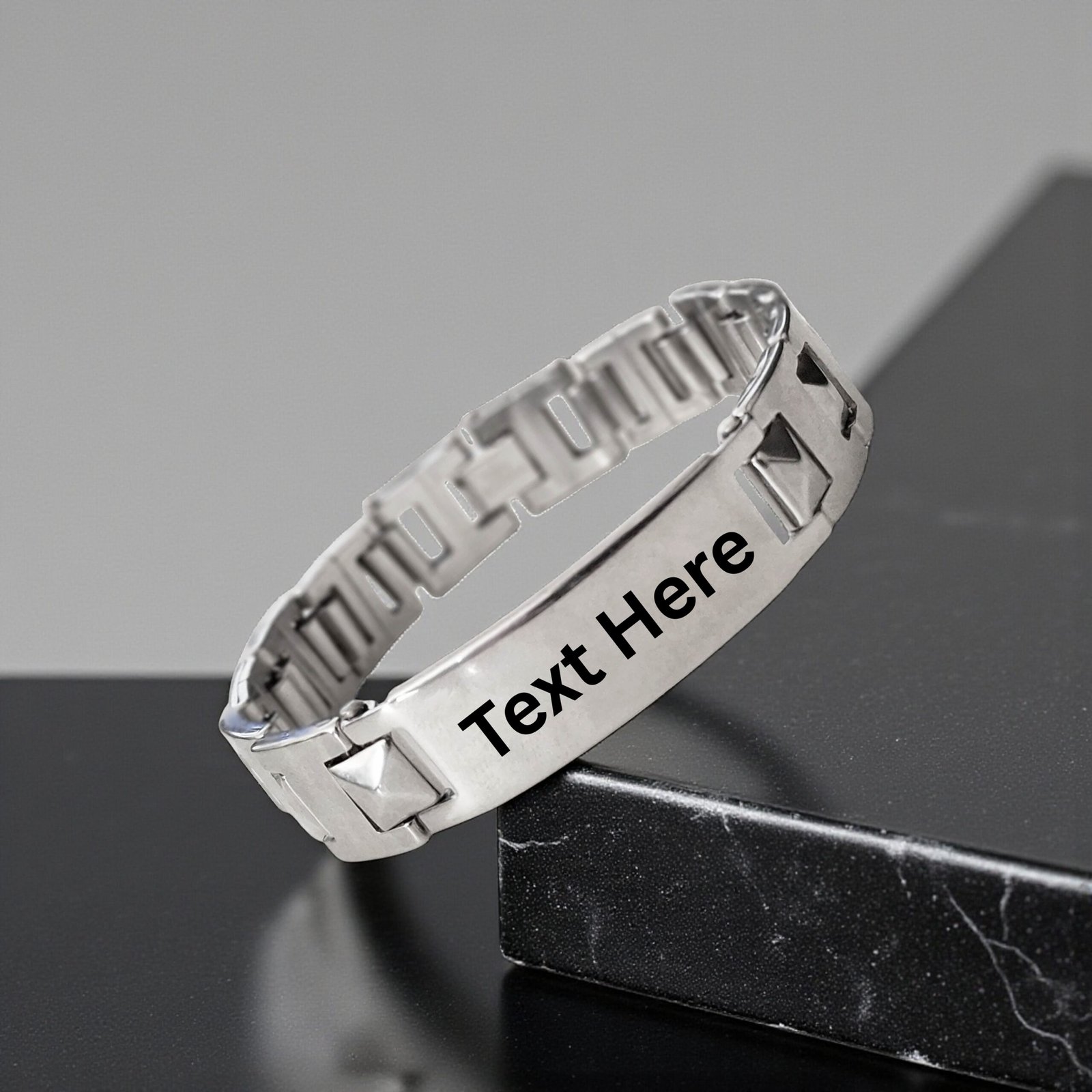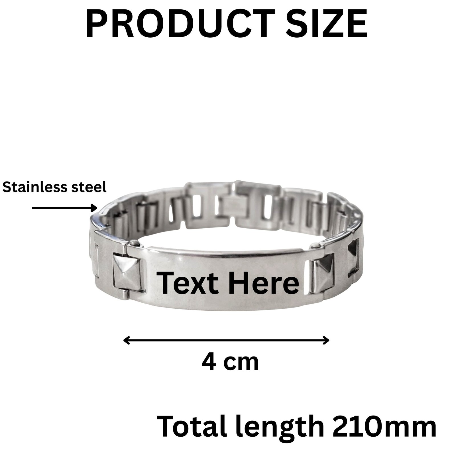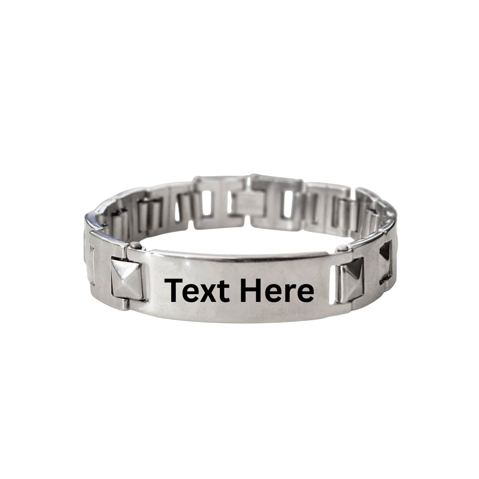 - Sleek. Strong. Sharp. This Men’s Stud-Link ID Bracelet is for the guy who carries presence. Crafted from durable stainless steel with raised pyramid studs and a blank engravable plate, it combines biker attitude with modern elegance. Whether you’re dressing it up or rocking it daily — this bracelet speaks bold without trying too hard. Personalize it with something raw and real — like “Hustle Mode”, “Ride Free”, or a simple date that matters.