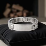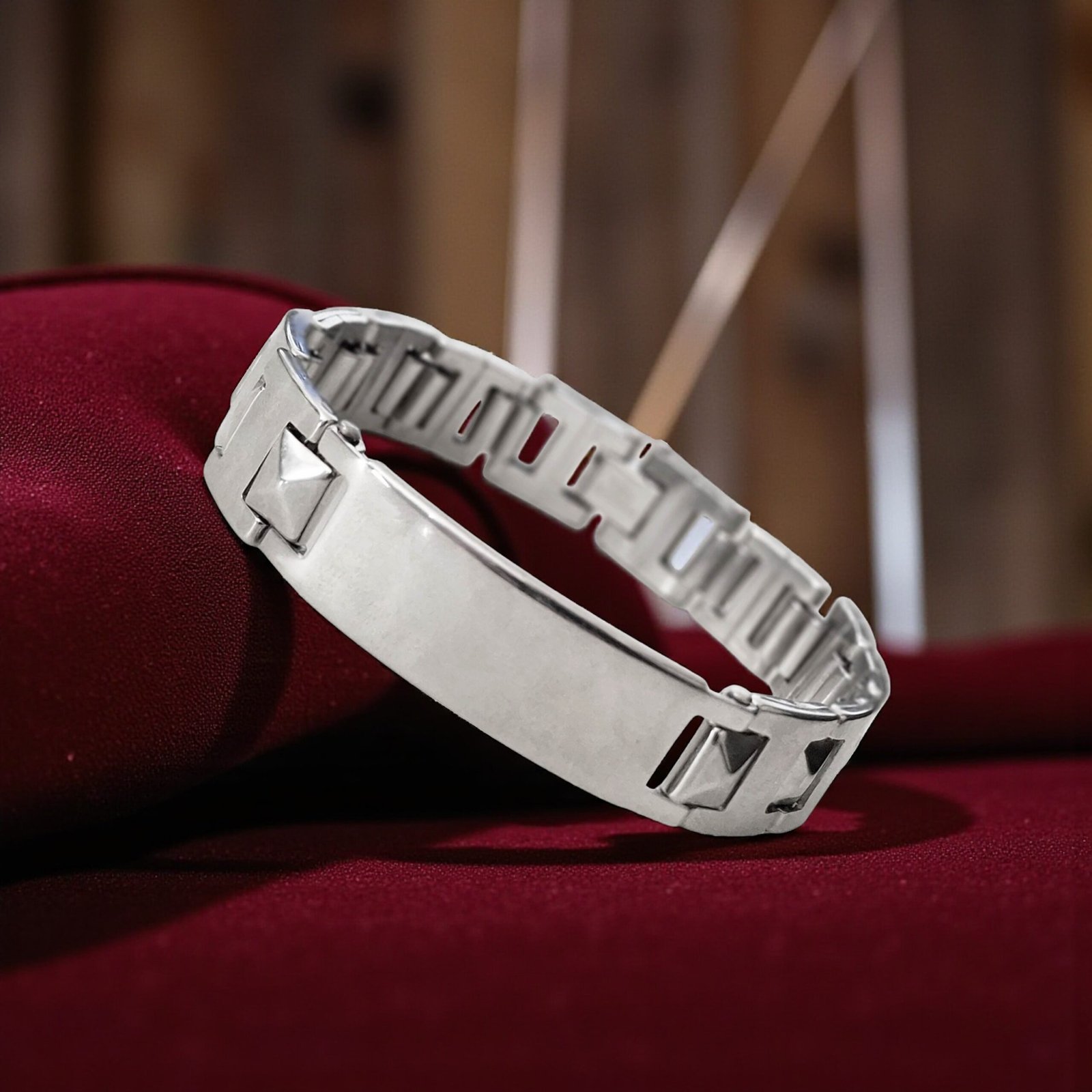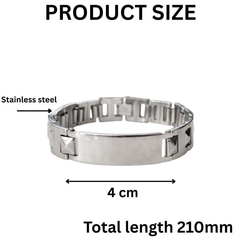 - Sleek. Strong. Sharp. This Men’s Stud-Link ID Bracelet is for the guy who carries presence. Crafted from durable stainless steel with raised pyramid studs and a blank engravable plate, it combines biker attitude with modern elegance. Whether you’re dressing it up or rocking it daily — this bracelet speaks bold without trying too hard. Personalize it with something raw and real — like “Hustle Mode”, “Ride Free”, or a simple date that matters.