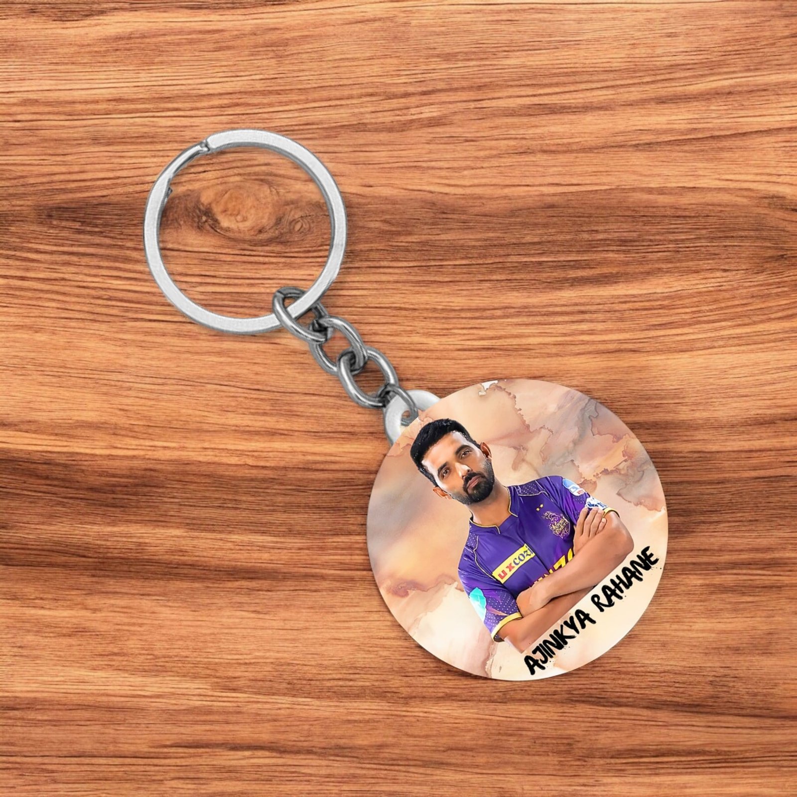 The Kolkata Knight Riders Ajinkya Rahane Keychain is the perfect collectible for every KKR fan! This premium-quality keychain features the iconic Kolkata Knight Riders logo on one side and a high-resolution image of star cricketer Ajinkya Rahane on the other. Made with durable materials, it is designed to be lightweight yet sturdy, making it ideal for everyday use. Attach it to your keys, backpack, or wallet and showcase your passion for IPL and KKR wherever you go. A must-have accessory for true cricket lovers and a great gift for die-hard fans of Ajinkya Rahane and KKR!