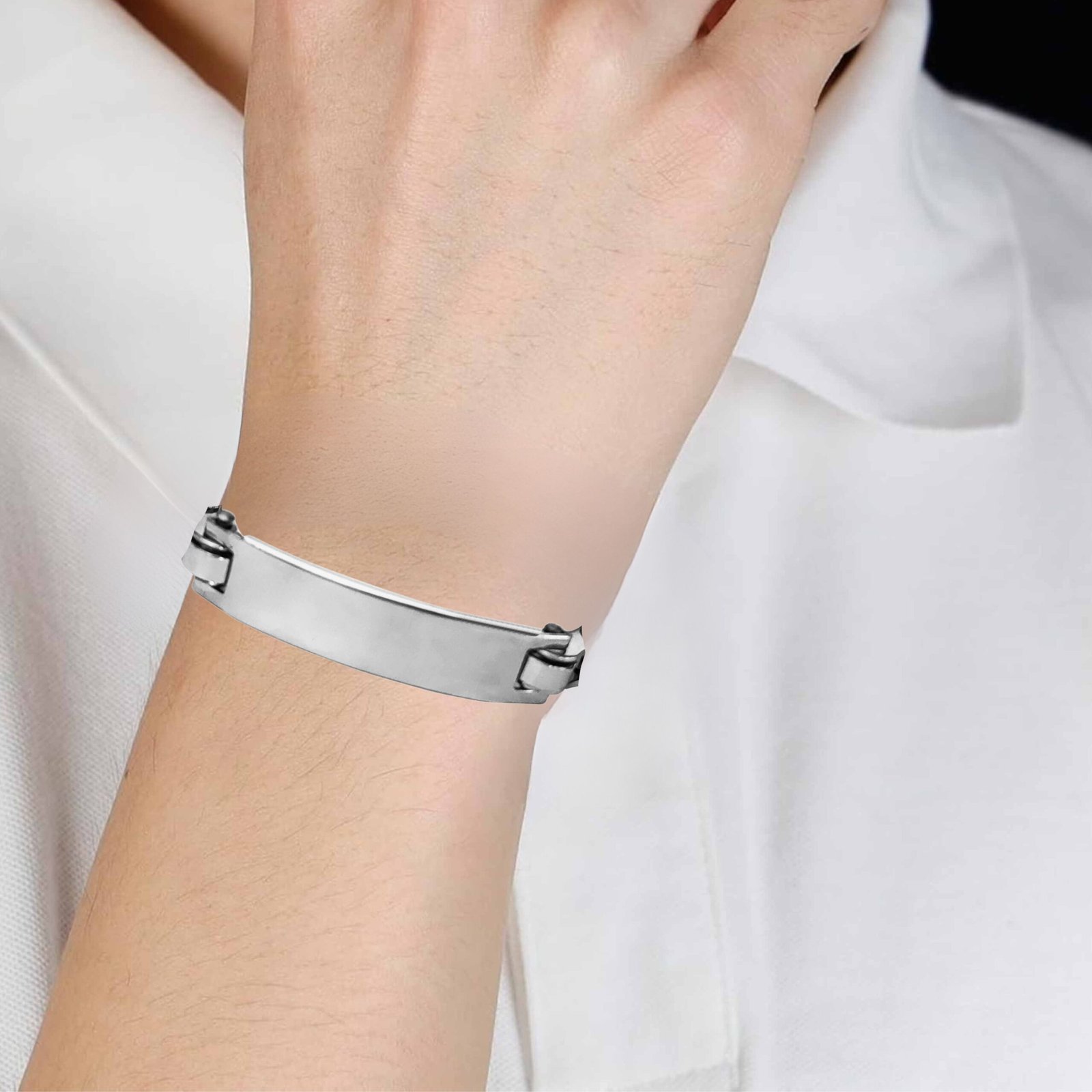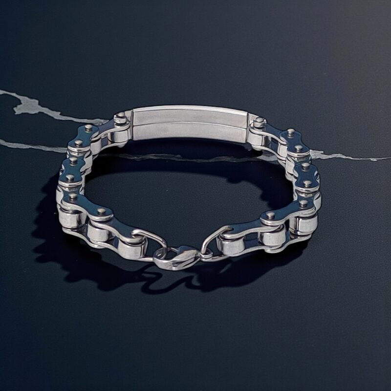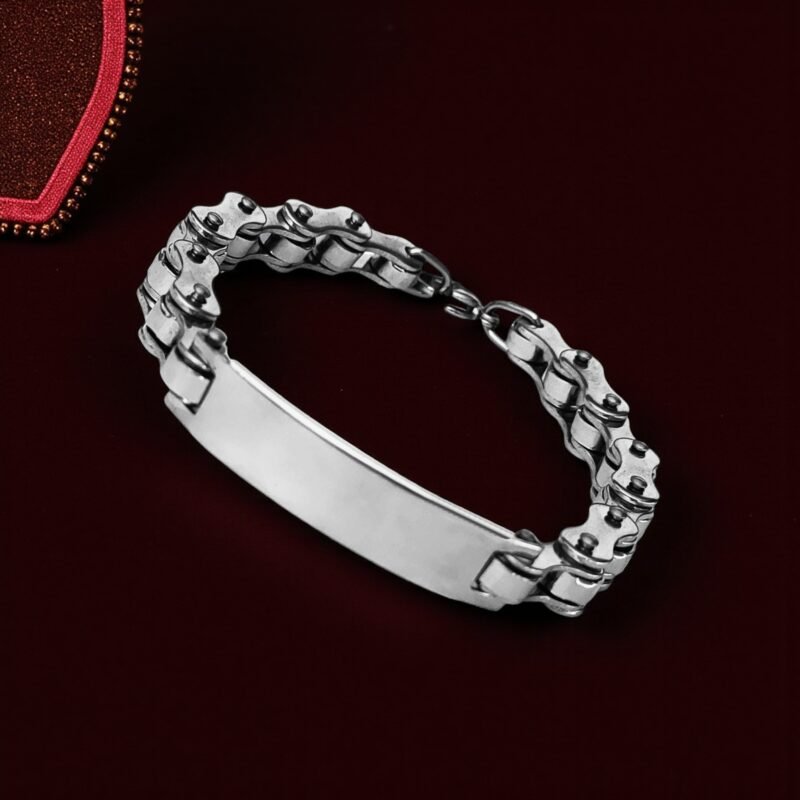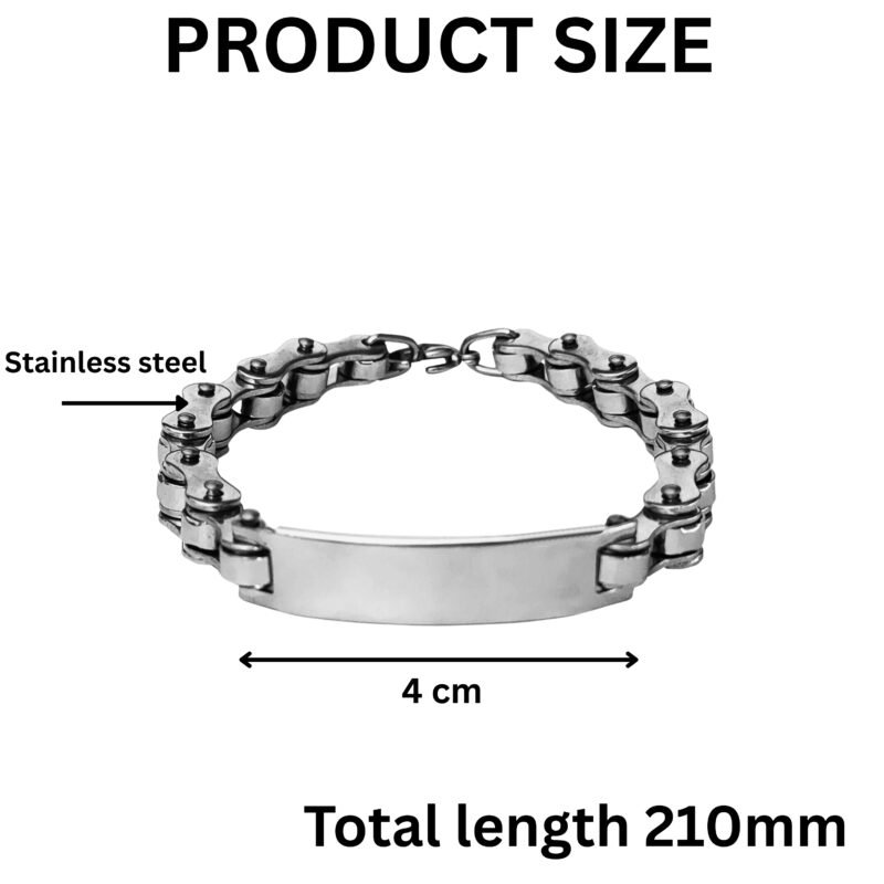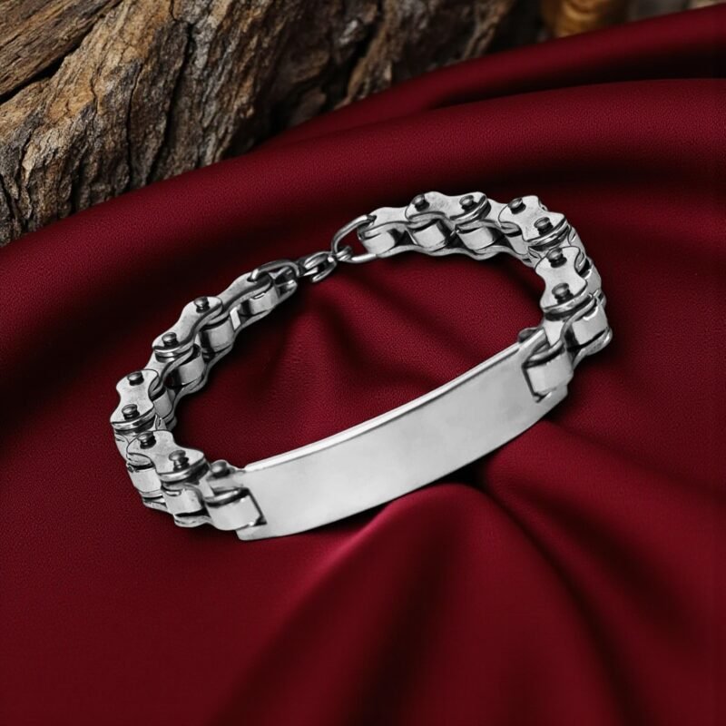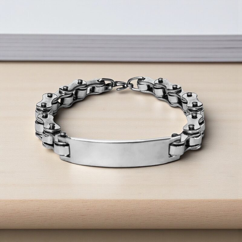 - Description: Crafted for bold style and lasting toughness, this stainless steel chain link bracelet makes a statement with its biker-inspired design. Its robust chain links mirror the strength and edge of motorcycle gear, while the sleek, polished ID plate provides space for engraving a name, date, or meaningful message. Designed for comfort and everyday wear, the bracelet features a secure clasp and adjustable length to ensure a perfect fit. Whether you’re accessorizing a casual look or gifting it to someone who loves industrial fashion, this piece blends utility with rugged charm.