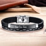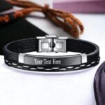 Our Engraved Bracelet for Men in Stainless Steel and Black Leather takes style to new heights! With multiple lines for personalisation, it’s just right for adding multiple names, a special quote, or a few words that hold special meaning.