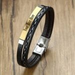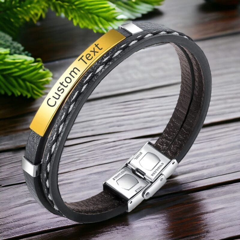 Our Engraved Bracelet for Men in Stainless Steel and Black Leather takes style to new heights! With multiple lines for personalisation, it’s just right for adding multiple names, a special quote, or a few words that hold special meaning.