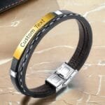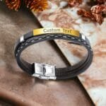 [Personalized leather bracelet]– This men’s leather bracelet with small custom Id is custom for you with any names and text, great for celebrating love, friendship, father’s day and family. Personalised Laser Engraved ID Bracelet