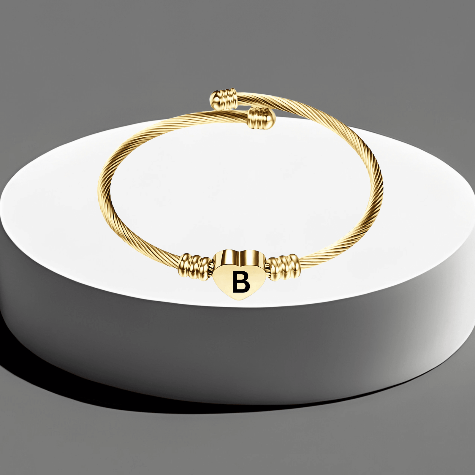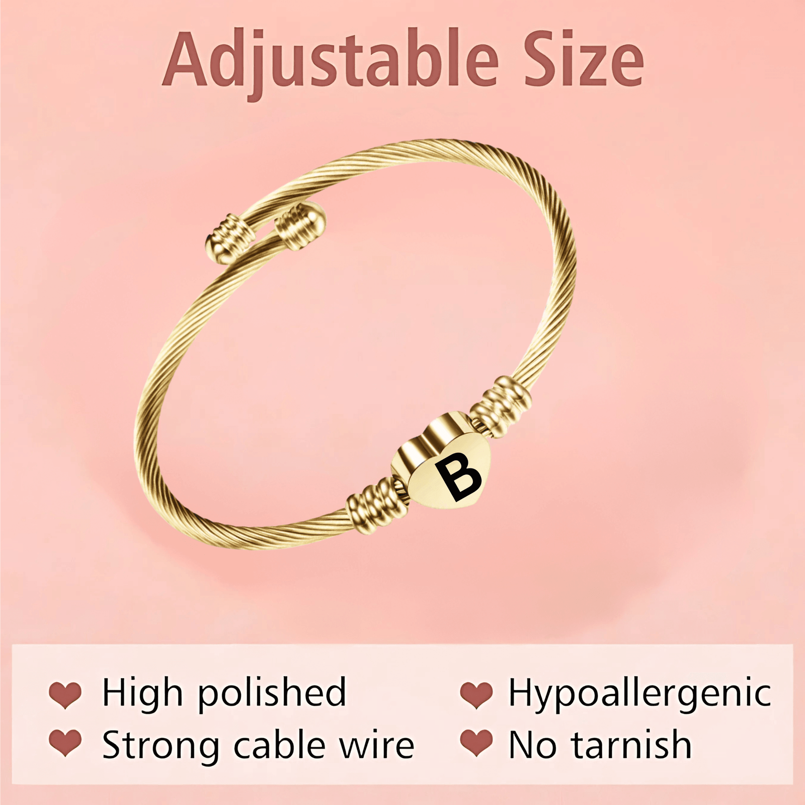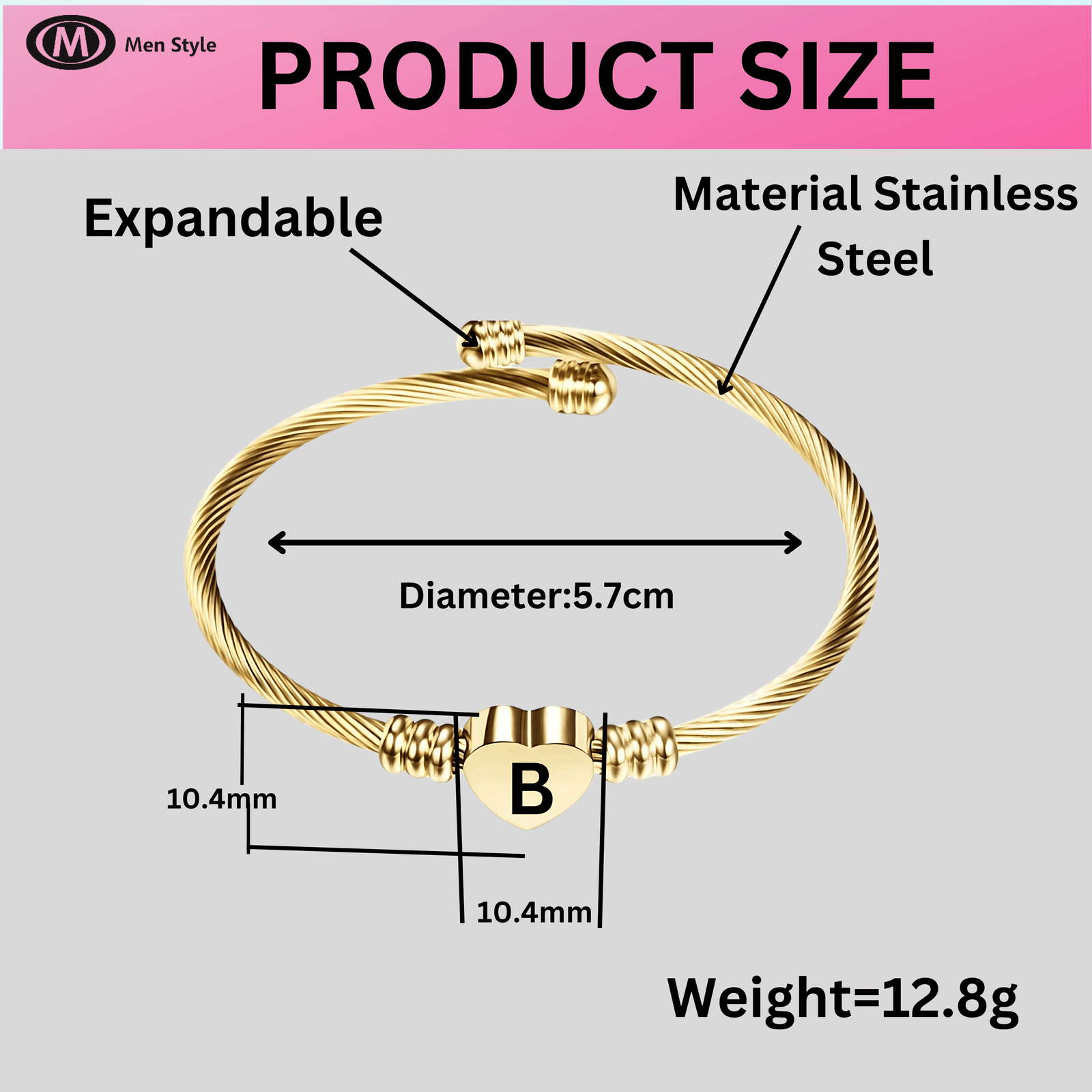 - Elegant but cute bangle bracelet with heart charm, fashionable and perfect to bright up your overall outfit. This romantic heart design with adjustable size feature will make it great mother gift and best friend bracelet. Customizable: We can engrave some words on the heart charm for you. Size:The Letter Cuff Initial Bangle Bracelet is Expandable,You can use a soft ruler to measure the circumference of your wrist or ankle so that you can choose the product that suits you.